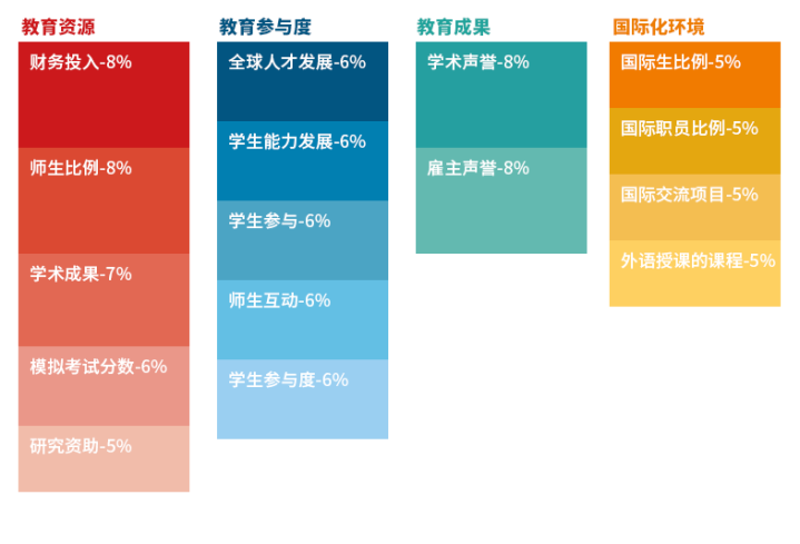 日本大学排名根据大学在四个支柱领域的表现,以平衡计分卡方法进行编制,涵盖16个指标: