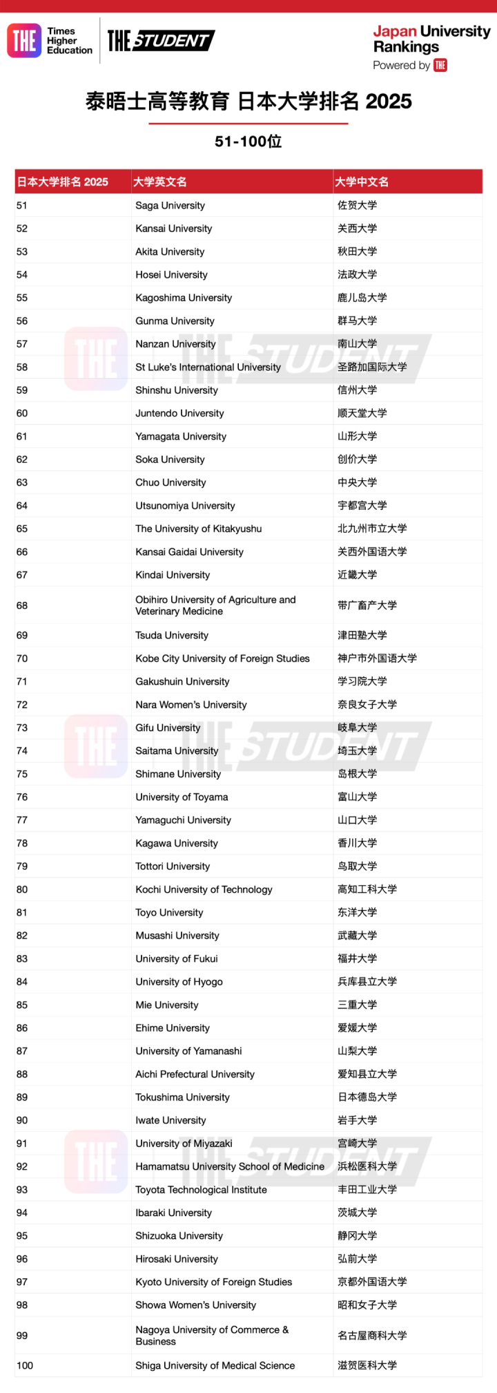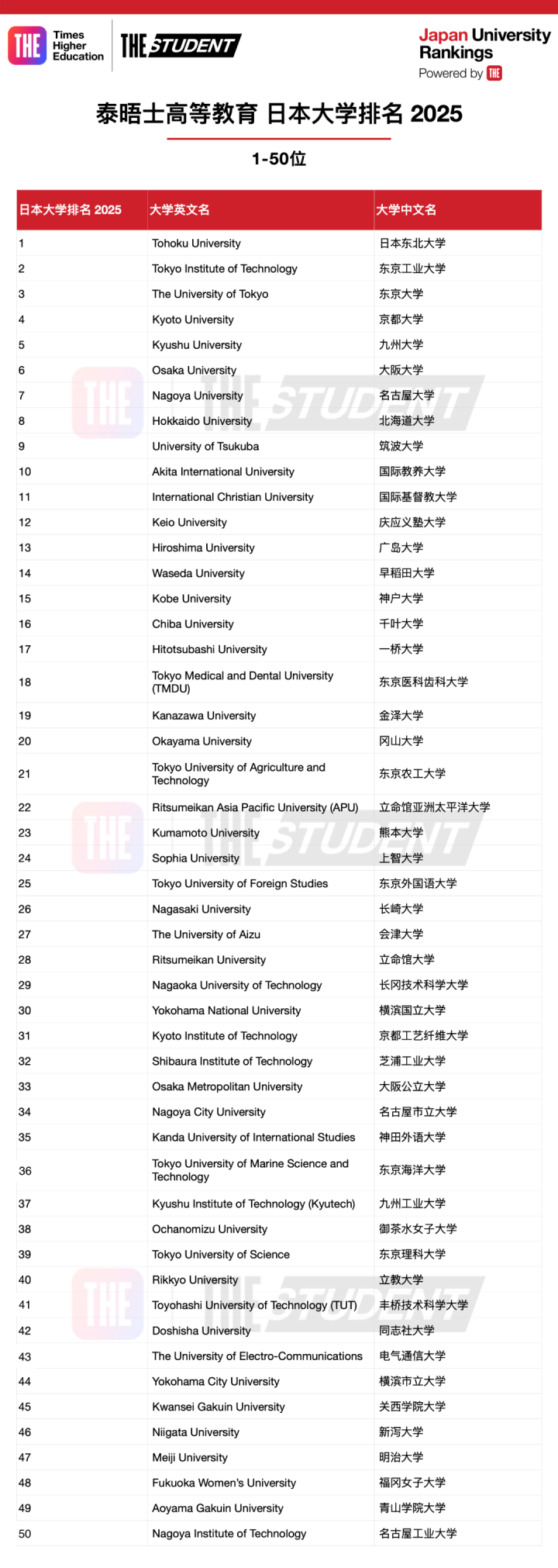 2025年日本大学排名正式发布,该排名是由泰晤士高等教育(Times Higher Education, THE)和日本教育公司Benesse联合编制的。2025年度的日本大学排名包含了257所大学,覆盖了日本全部47个一级行政区(都道府县)。